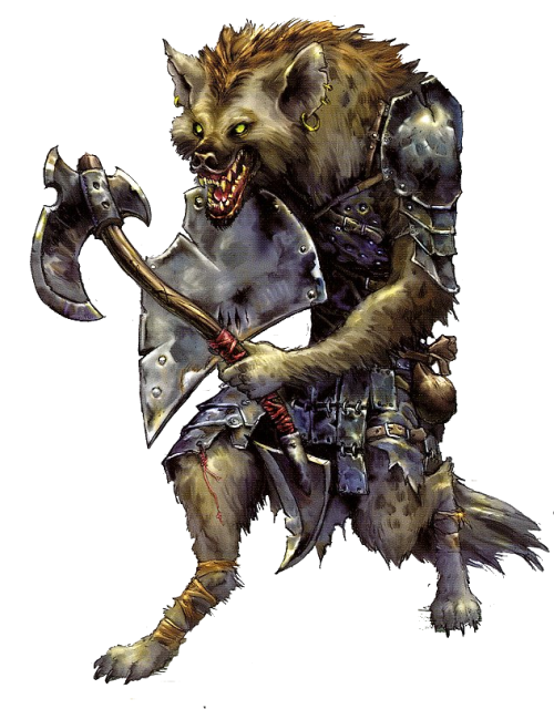 Personnalité. Le gnoll de base a peu de vertus qui pourraient le racheter. Il est cruel haineux et brutal, prêt à piller et tourmenter les plus faibles à la moindre occasion et tout aussi prompt à ramper en présence de plus fort que lui. Paresseux et irritable, il préfère voler ce dont il a besoin et tuer tous ceux qui trouvent à y redire. Seule la perspective du butin et du meurtre facile peut le pousser à l'action et même dans ces conditions, il se montre toujours prêt à abandonner les tâches en cours pour satisfaire son instinct. chapardeur, à moins qu'un chef autoritaire ne sache lui inculquer la discipline par la terreur.